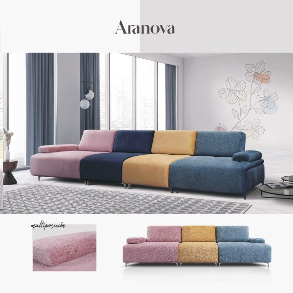 Un estallido de creatividad y color llega con el sofá Aranova, diseñado para quienes buscan romper con lo convencional. Sus novedosos bloques transforman cualquier estancia en un espacio dinámico y lleno de energía. Además, su sistema multiposición garantiza una experiencia de relax adaptada a tus momentos. Aranova no es solo un sofá, es una declaración de estilo y personalidad.
