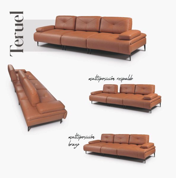 El sofá Teruel está diseñado para adaptarse a tus necesidades y estilo de vida. Con respaldos y brazos multiposición, ofrece una personalización total para que encuentres la postura perfecta en cada momento. Su diseño contemporáneo y tapizado de alta calidad añaden un toque de distinción a cualquier espacio. Teruel es ideal para quienes buscan un sofá que combine funcionalidad, comodidad y un estilo que no pasa desapercibido. Dale a tu hogar el confort que merece.