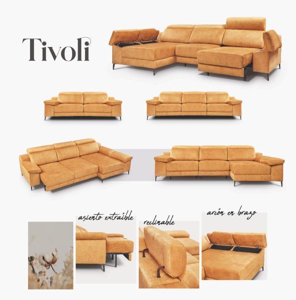 Con Tivoli, tu salón se convierte en un espacio pensado para el descanso perfecto. Este sofá destaca por su diseño contemporáneo y su versatilidad, ideal para adaptarse a tu estilo de vida. Sus amplios asientos y respaldos ergonómicos te envuelven en una experiencia de comodidad única, mientras que sus acabados impecables y detalles de alta calidad lo convierten en un auténtico protagonista del hogar. Tivoli es más que un sofá, es tu refugio diario con estilo.