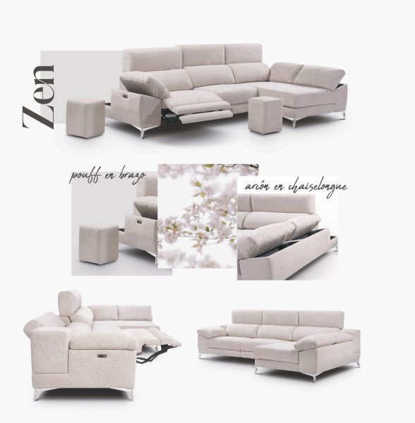 El sofá Zen combina armonía y funcionalidad para crear un espacio de relajación inigualable. Con un diseño moderno y líneas suaves, este modelo se adapta perfectamente a cualquier ambiente, aportando serenidad y estilo. Cuenta con un sistema relax motorizado que se ajusta a tus necesidades de confort, mientras que los prácticos arcónes en la chaise longue y los brazos, junto con el pouf integrado, ofrecen soluciones de almacenamiento inteligentes y versátiles. Fabricado con materiales de alta calidad y un diseño ergonómico, el sofá Zen no solo decora tu salón, sino que transforma cada momento en una experiencia de equilibrio y bienestar.
